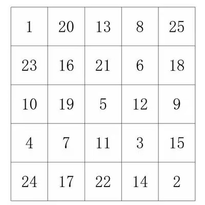 在正方形紙張上畫出5cm×5cm的25個正方形方格,格子上任意填寫1-25的阿拉伯?dāng)?shù)字,讓孩子按照1-25的順序依次指。